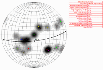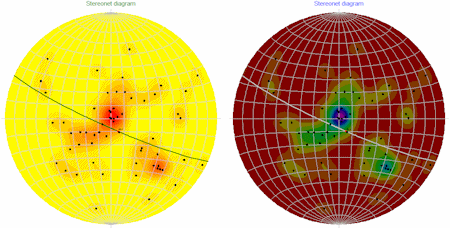 ! Note Stereonet contours are based on point distributions within a Schmidt projection (equal area) diagram. If you plot points on a Wulff stereonet AND include contours, you may note that the point densities and contours might not correspond.