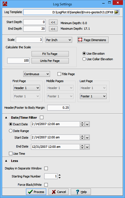 The process of compiling a single log involves selecting the data file that contains the data to be displayed on the log, and establishing the compiling settings.
