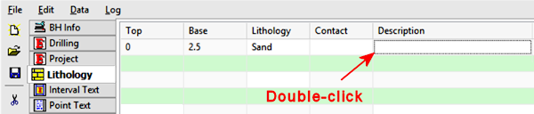 Clayey, silty, <b>brown</b>, <i>damp to moist</i><br>IMPORTANT: The font type (Arial, Times, etc.) and the font size are defined in the log design - you cannot define type and size in the data file. The font style, color, and effects - bold, italic, color, etc. - can be defined in both the log design and in the data file. Any text WITHOUT style, color, or effect formatting in the data file will plot using the defaults established in the log design. Any text WITH style, color, or effect formatting in the data file will override the design defaults.