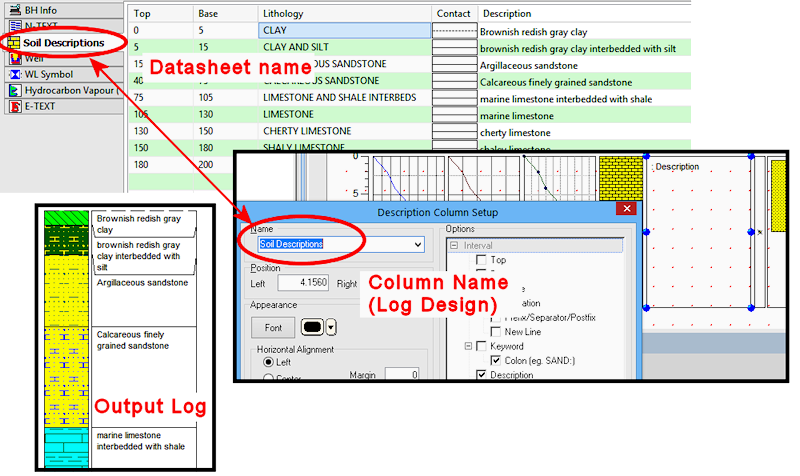 Example: The data in a Lithology datasheet with the name of "Soil Descriptions" will link to the Lithology Description column in the log design with the same "Soil Descriptions" name.