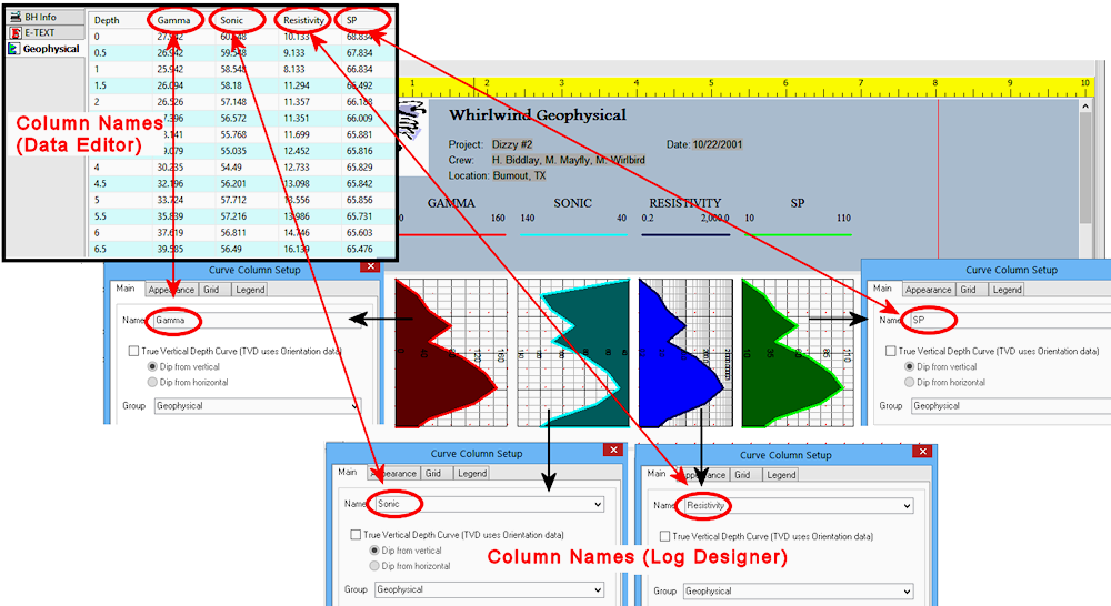 - For single-type datasheets (those that do not allow multiple columns of different data measurements) the name is very important - it is how LogPlot matches the data to an item in the log design.