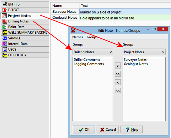 The Edit Rows and Groups option is a handy tool in the LogPlot Data menu which lets you change (1) the order of the rows in a single datasheet or (2) the datasheet where an Edit Notes item resides. You can also use this option to add, delete, and rename items.