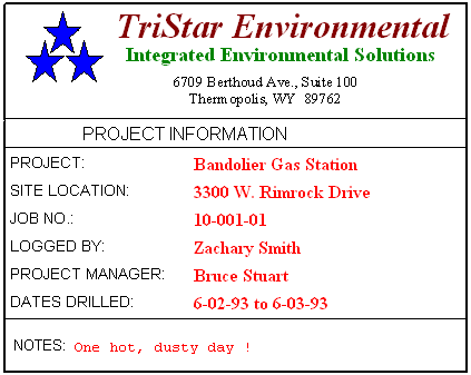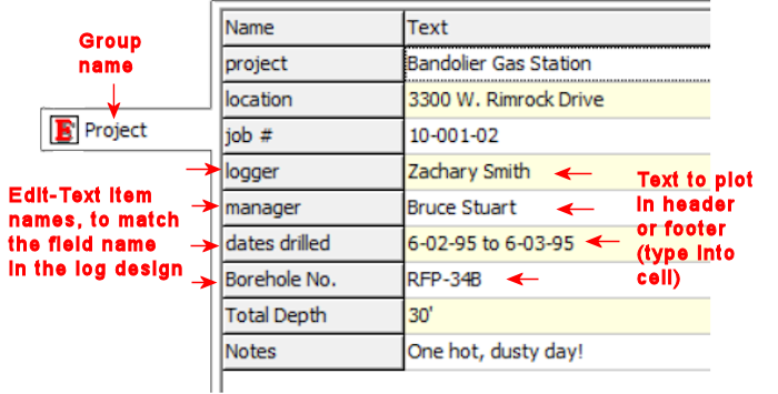 Corresponding log design component: Text listed in this datasheet will be plotted in the header or footer portion of the log within the Edit Text fields of the same names.