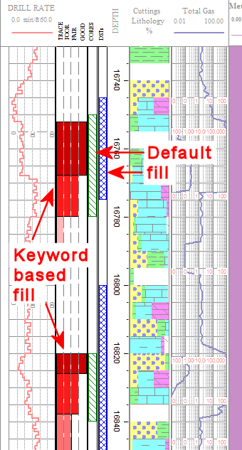 If you enter a keyword for the interval, the fillbar interval will be filled with the pattern that is associated with keyword. Like a Lithology datasheet, this field links to the current Keyword File. In this way, you can specify the pattern design, background and foreground colors, pattern density, and fill percent. In the Shows example above, the 4 different keywords were defined with different colors and different fill percentages ("trace" filling 25% of the column, "good" filling 100%).