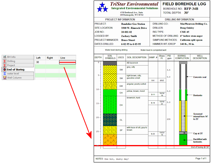 This example shows how a horizontal line might be used to show the total depth on a shallow borehole log.