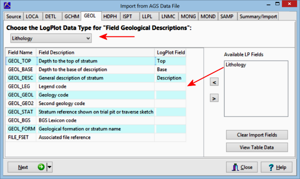 - Available LP Fields: Lithology: Use your mouse to drag this field, representing Lithology Keywords, to the desired AGS field. Click the View Table Data button if you would like to look at the AGS data.
