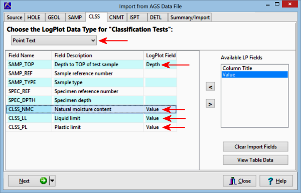 - Available LP Fields: This pane, along the right side of the window, will display the LogPlot Point Text fields which you can associate with the AGS data fields.