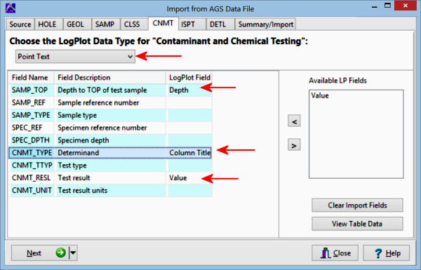- Click on the AGS data tab at the top of the import window to select the data you wish to map to a LogPlot Point Text datasheet.