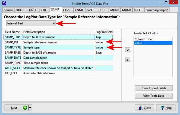 - Click on the AGS data tab at the top of the import window to select the data you wish to map to a LogPlot Point Text datasheet.