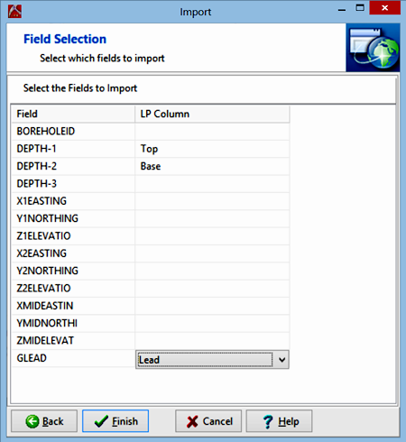 - Identify the first field you wish to import by clicking in the LP Column cell for that field and identifying the column in the datasheet where the data is to be imported. Repeat for additional fields. Any DBF fields you don't want to bring into LogPlot can be left blank (unmapped).