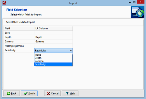 - Identify the first field you wish to import by clicking in the LP Column cell for that field and identifying the column in the datasheet where the data is to be imported. Repeat for additional fields. Any text file columns you don't want to bring into LogPlot can be left blank (unmapped).