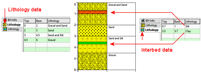 This example illustrates 4 lithology intervals (left) with two interbeds declared (right). Notice how the names on the datasheet tabs match (both are "Lithology").