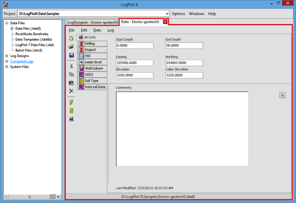 The LogPlot Data Editor is accessed via the "Data" tab.