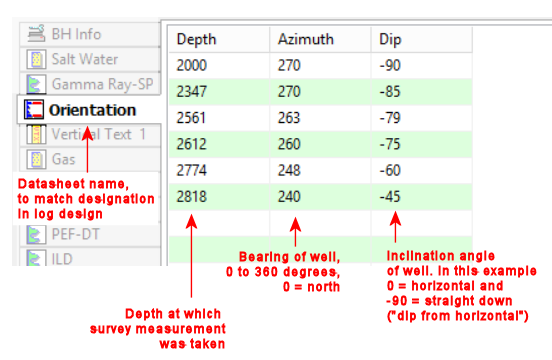 Use: The LogPlot Orientation datasheet is used to enter downhole survey information for non-vertical wells. This information can be reflected on a strip log scale bar that’s linked to the Orientation data tab, or displayed in a Curve column showing true vertical depth.