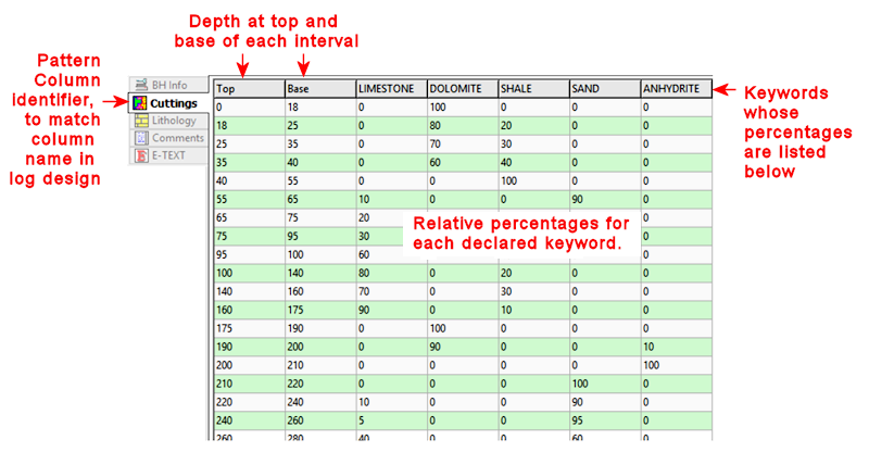Top, Base: In these columns you must list the depth at the top and the base of the pattern percent interval being described on that row. Depths are entered as positive values.
