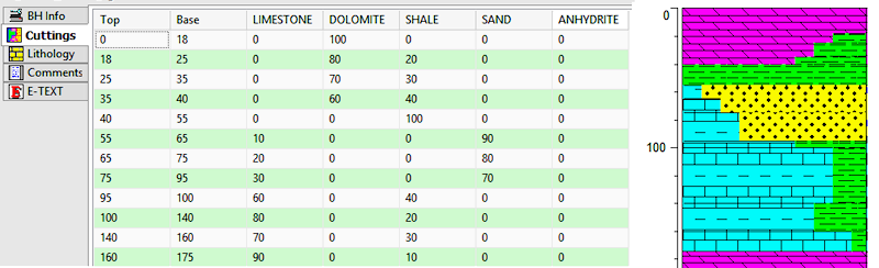 This illustrates the use of a Pattern Percent column to represent relative lithologies measured from the drill cuttings.
