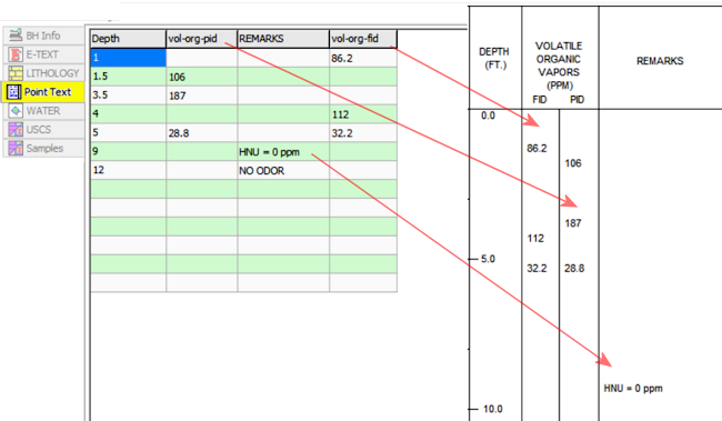 This example illustrates the use of several Point Text columns in the datasheet and log.