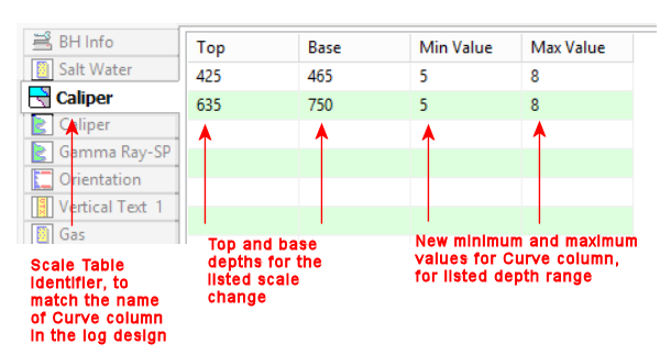 Top, Base: In these columns you must list the depth at the top and the base of the interval where the curve scale is to be changed. Any data outside these depth ranges will be scaled as defined as default in the log design.