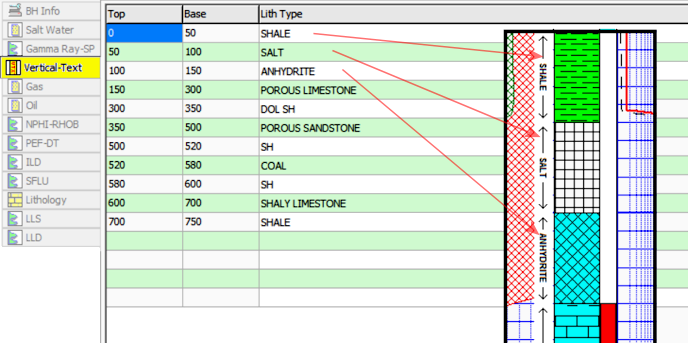 For horizontal text to be plotted between depth intervals, use the Interval Text datasheet.Corresponding log design component: Text listed in this datasheet will be plotted on the log within the Vertical Text column of the same name.
