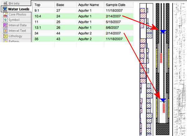 Use: The LogPlot Water Level datasheet is used to enter a depth to the top and base of an aquifer, aquifer name, and measurement date. You can list multiple depths for multiple aquifers for multiple dates, as shown in the example below.