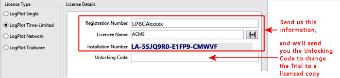 LogPlot Time-Limited: Choose this if you have purchased a time-limited license for the program. With this license type, the software can be installed onto a single computer for one person to use, for a limited period of time. This type of license requires an "unlocking code" which is supplied by RockWare.