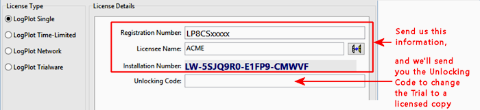 Choose the LogPlot Single license type if you purchased a Single license of the LogPlot8 program. With this license type, the software can be installed onto a single computer for one person to use. This type of license requires an "unlocking code" that is supplied by RockWare.