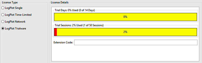 LogPlot Trialware: Choose this option in the licensing screen to run the full LogPlot program for a two week trial period. Use this mode to test out the program or to use the program while you wait for your unlocking code or network license manager.