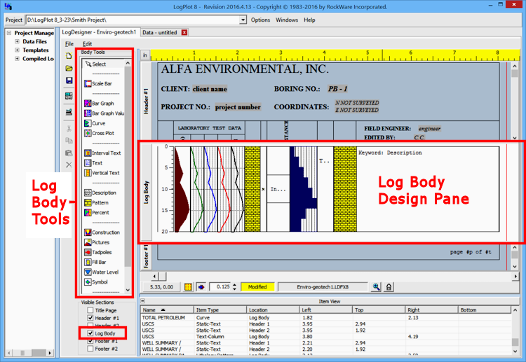 When you open an existing log design (Log Designer | File | Open or File | Import LogPlot7), the log body items will be displayed in the design pane.