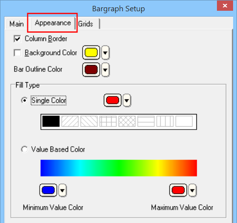 Choose Single Color if you want the bars to be filled with a pattern or solid of a single color. Select the pattern to be used to fill the bars by clicking in one of the pattern boxes, and choose the fill color.