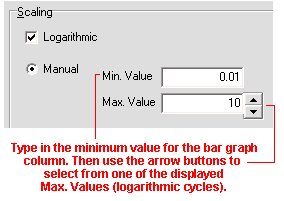 - Logarithmic Scaling: For the Min. Value, enter the non-negative and non-zero real number to represent the minimum value of the logarithmic bar graph column. You may then select the appropriate Max. Value using the up- or down-arrows next to that prompt. You are restricted to even logarithmic cycles, such as 0.2 to 2,000, 1 to 10,000, etc.