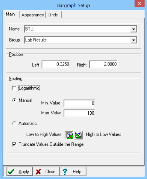 Use the settings on the Main tab of the Bargraph Setup window to define the name and positioning for the bar graph column, and to establish the data range and scaling.