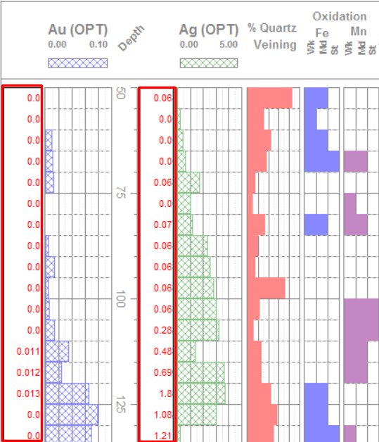 How it works: As you compile your log in LogPlot, the program will locate data in columns in Interval Data or Time Data datasheets, and it will plot the numeric values as textual labels in the Bar Graph value column of the same name. This can pull values from the same datasheet as an associated Bar Graph column. The labels may be left or right-justified, opaque or transparent.