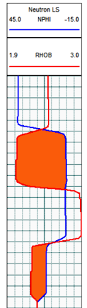 A Cross-Plot Curves column is a specialized type of curve-plotting column, in which two curves are displayed in the same column. Distinct colors can be selected for the curves themselves, and for the region where the curves cross.