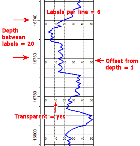> If you want to bump the labels above the depth intervals, you need to enter the offset as a negative value; "-2" will place the top of the label text 2 feet above each depth interval.Labels per line: Type in the number of labels to appear at each depth interval. This will include the minimum column and maximum column values at either side of the column, and any additional labels in between.