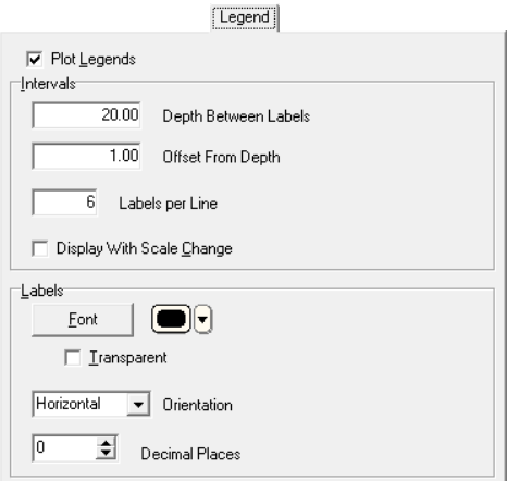 The Legend tab in the Curve Column setup window is used to activate and configure automatic values labels that can be plotted at periodic intervals in a Curve column.