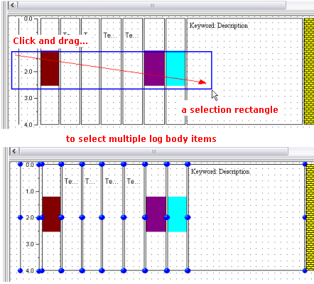 - Use the screen pointer to "draw" a rectangular region across the log body area. Any items in whole or in part within that bounding rectangle will appear selected (with "handles").