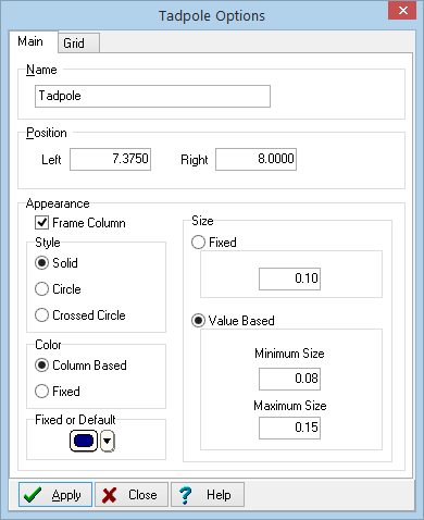 Color: Choose Column-Based if you have declared colors for each measurement in the data file. Choose Fixed to select a constant color for the tadpole symbols.