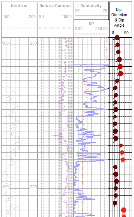 How it's used: A Tadpole column is used to display structural readings (bearing and dip) at depth, using special "tadpole" symbols. The symbols can be fixed or variable in size and color.