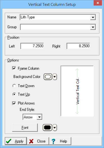 Text Down, Text Up: These radio buttons are used to specify whether the text labels are to be plotted downward or upward in the column. Note the preview in the dialog box which shows examples.
