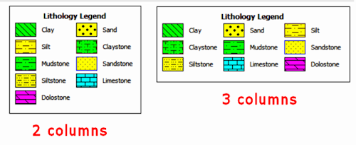Columns: Use the up- or down-arrows to increase/decrease the number of columns for placement of the pattern-label combinations. LogPlot will wrap the items as needed. Examples: