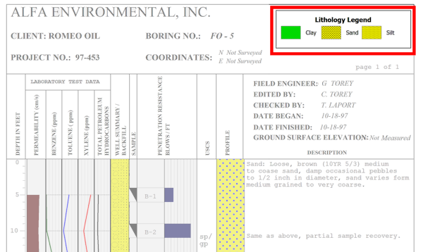 The Header/Footer Pattern Legend item is used to display user-selected keywords and patterns in a table-style legend in the log's header or footer. You build the legend by selecting the keywords to be displayed, with editing options to change how the labels and pattern are displayed in the legend.