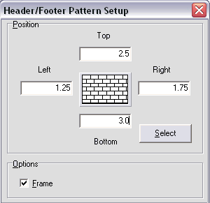Select: To select the pattern to be displayed in the header or footer block, click on the Select button. Or just click on the graphic pattern block in the middle of the window. The program will display the Select Pattern window.