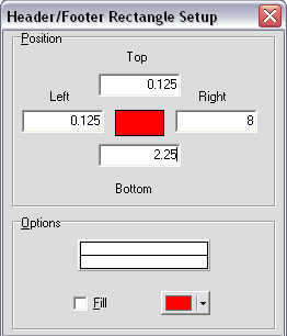 You can use the Header/Footer Rectangle Setup window to adjust the rectangle's position, the line style, thickness, and color, and its fill color, if any.