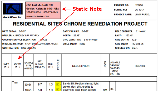 Design file example(s): The example above illustrates Static Notes entries in the "My Documents\LogPlot 8\Samples\Enviro-Geotech3" log design. See the Enviro-geotech6 log design for an example of a Static Note used to enter a company name and address.