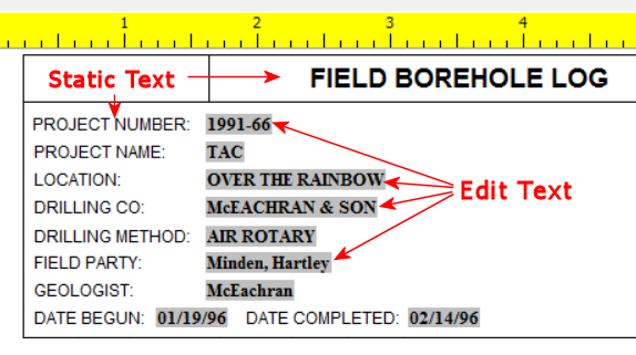 Here is a design which illustrates the use of Static Text items as labels for changing "Edit-Text Entries" discussed in another topic. In the excerpt shown below, the labels "PROJECT NUMBER:", "PROJECT NAME:", "LOCATION:", etc. are Static Text items that will remain constant each time this log is compiled with data. The accompanying text "1991-66," "TAC," "OVER THE RAINBOW," etc. are Edit Text items whose text is listed in the data file and may change each time this log format is compiled with new data.