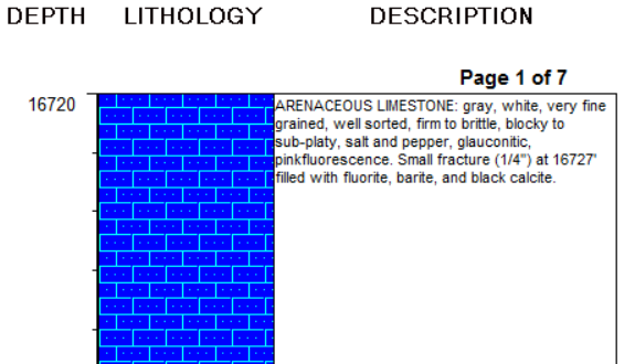 The Static Text item is used to plot textual labels in the header or footer portion of the log, specifically text that is constant from log to log. Static Text is used to label columns, to plot the unchanging log details (company name, logo), or to serve as a label for changing text entries (via the Edit Text button). It can also be used to insert automatic page numbers, well location information, and the data in the header or footer, using macros. All of the red labels in the compiled log example below are Static Text items. The labels shown in black are Edit Text entries.