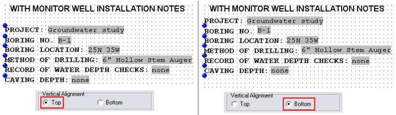 Vertical Alignment: Click in a radio button to choose how the text is to be aligned vertically relative to the insertion handle. In the examples below, the six Static Text labels are set to Left horizontal alignment, and show the difference between Top and Bottom vertical alignment.