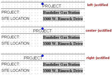 Horizontal Alignment: Click in a radio button to choose how the text is to be aligned horizontally relative to the insertion handle. In the graphic example below, the "PROJECT" label is set to Top vertical alignment, and shows the difference between left-, center-, and right-aligned text.