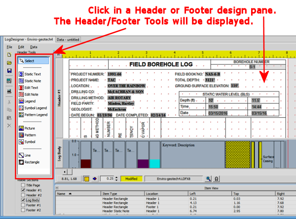 Here is a summary of the items that you can include in a Log Design header and footer (the log header and footer sections share the same tools). The tool buttons are found in the Log Designer tool pane, to the left of the program window. These items are discussed in the remainder of this section.