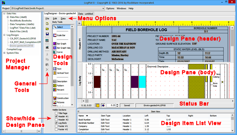 Before you get into the log design items themselves, you should familiarize yourself with some general design features of the program. The "Design Screen" is your work area: designing logs is simply a matter of "drawing" the desired format items in their appropriate positions on the design screen as if it were a piece of paper. When you open a log design (LogPlot is shipped with many), the program screen will look something like the example shown below. These screen items are summarized below.